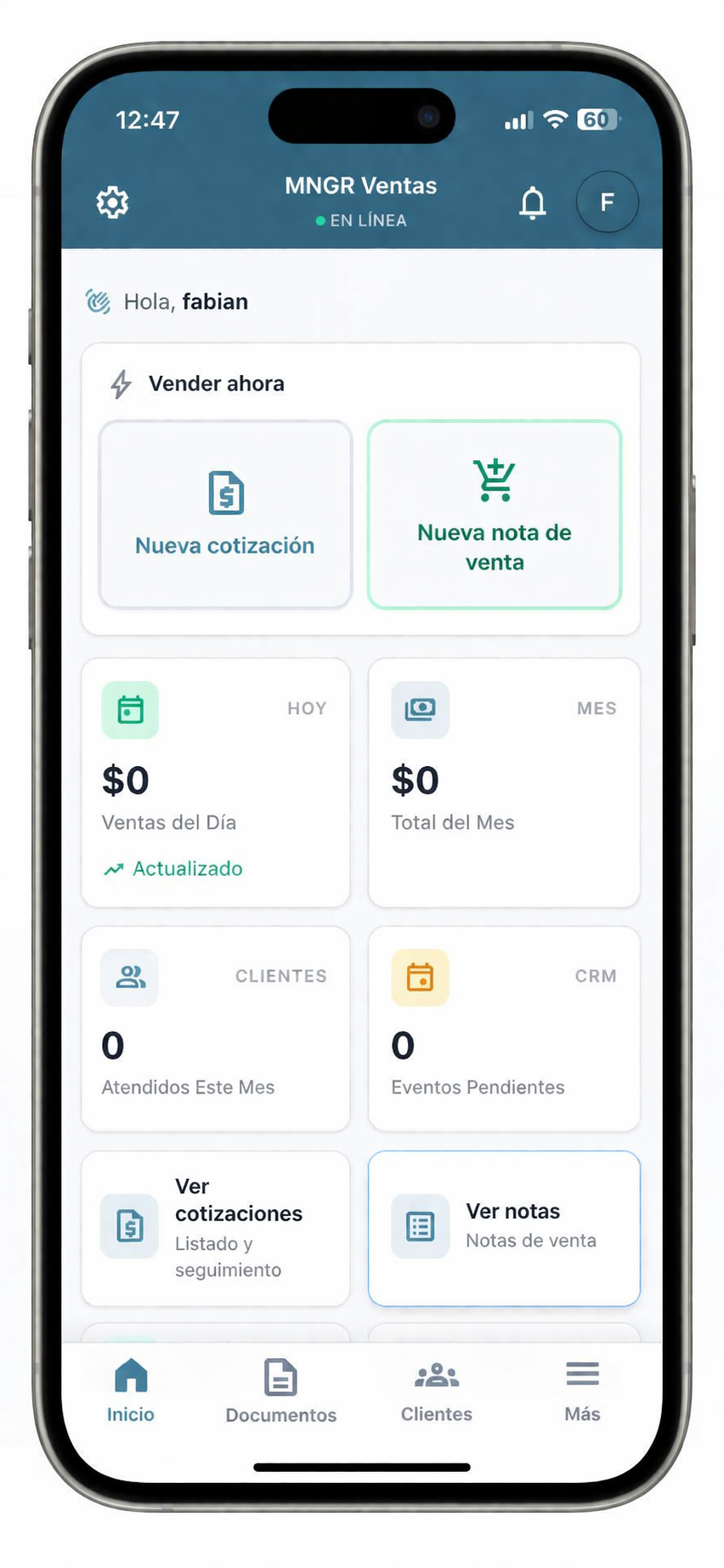 Para vendedores en terreno: cotizaciones, seguimiento y notas de venta desde el celular, con trazabilidad hacia tu operación.